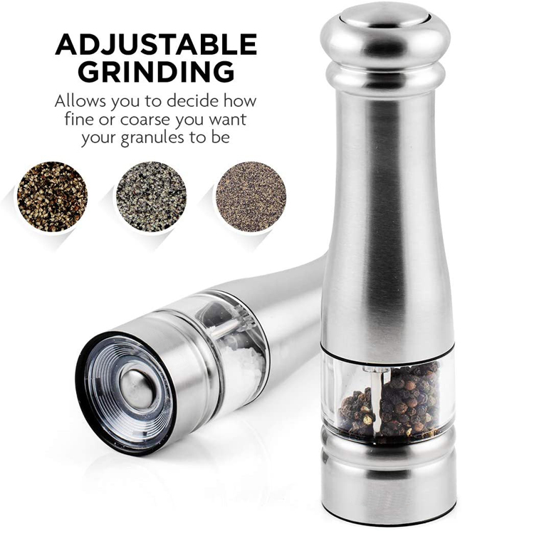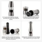 • Stepless Adjustable Coarseness: automatic salt and pepper grinder set infinitely customize grind texture from fine to coarse. Top-facing outlet prevents spills; transparent ABS hoppers allow easy filling and cleaning